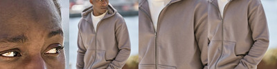 Relaxed fit. Brushed inside. Half-moon for personalised branding. Ribs with elastane and SBS zipper. Label free.