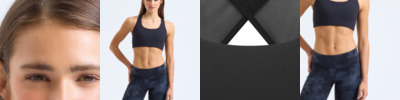 80% Recycled polyester, 20% Elastane. High impact. Certified recycled polyester. Stretch fabric. Mesh crossover back detail. Bust seam shaping. Adjustable straps. Adjustable bra clasp fastening to the back. Double-layer fabric for additional support. Removable bra pads.