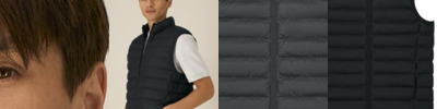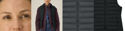 100% Recycled nylon. Men’s bodywarmer. Medium fit. Sleeveless. High collar. Reverse nylon zip at centre front. Zipped welt pockets with extra grosgrain puller. Elastic tape binding at the armhole. Fully quilted. Side panels for a better shape. Inside seams with binding finish. Bottom hem has an adjustable plastic stopper and elastic cord.