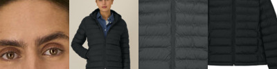 100% Recycled nylon. Women’s padded jacket. Fitted. Set-in sleeve. High collar with grown-on hood. Hood opening and bottom hem have an adjustable plastic stopper and elastic cord. Reverse nylon zip at centre front. Zipped welt pockets with extra grosgrain puller. Fully quilted. Side panels for a better shape. Self-fabric elasticated cuff. Inside seams with binding finish. Bottom hem has an adjustable plastic stopper and elastic cord.
