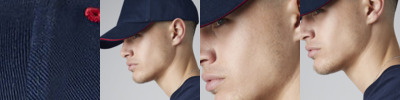 Structured front panel. 5-panel design. Pre-curved peak. Contrasting colour piped peak edge. Stitched ventilation eyelets. Self-fabric strap with tri-glide buckle.