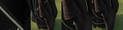 Golf towel with 10cm herringbone border for easy decoration. Metal rivet in corner of top edge.