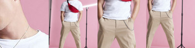 Adjustable webbing belt with secure clip fastener, large zippered main pocket, zippered rear pocket.