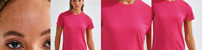 Performance T-shirt. Cationic dyed. Recycled polyester. Wicking fabric. Stretch. Crew Neck. Short Sleeve. Lightweight. Feminine fit. Twin-needle stitching on hem and arms. Textured fabric. Product contains no branded neck or waist label. Removable Kimble or looped garment tags. Inner seam label holds important product information on one label with a second label containing brand information which can be cut-away. UPF 40+.