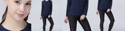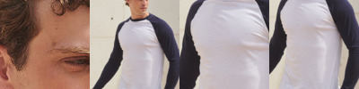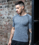 Fitted style with high-stretch fabric. Melange effect. Self fabric bound collar. Raglan sleeves with contrast flatlock stitching. Textured knit detail along raglan seams and sides. Blind stitched cuffs and hem.