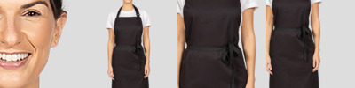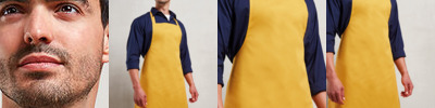 65% polyester/35% cotton. Self fabric neckband (in transition). Self fabric ties. Reinforced straps. Width 71cm. Length 91cm. Domestic wash 40°C.