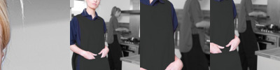 65% polyester/35% cotton. Large patch pocket. Adjustable stud side tabs. Length 74cm. 85°C wash.