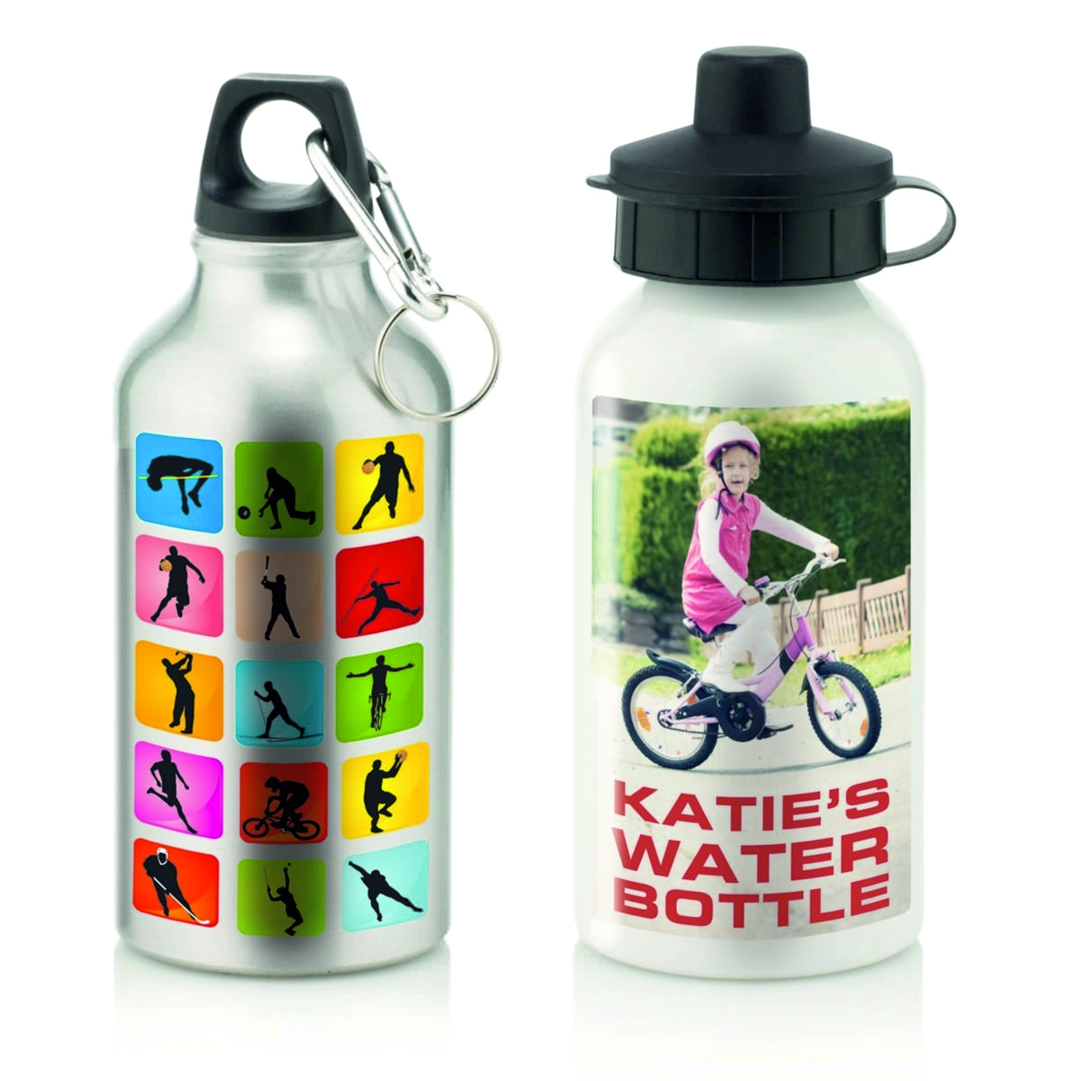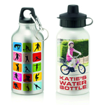 A 400ml aluminium water bottle ready for personalising. Available in white and silver with 2 caps included.