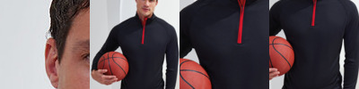 Contrast ¼ zip. Long sleeves. Stretch. Twin-needle stitching. Wicking fabric. BSCI certified. SEDEX certified. WRAP certified. We recommend using block out vinyl and inks.Product contains no branded neck or waist label.* Removable Kimble or looped garment tags. Inner seam label holds important product information on one label with a second label containing brand information which can be cut-away.