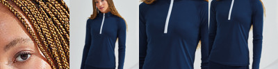 Contrast ¼ zip. Long sleeves. Stretch. Twin-needle stitching. Wicking fabric. We recommend using block out vinyl and inks.Product contains no branded neck or waist label. Removable Kimble or looped garment tags. Inner seam label holds important product information on one label with a second label containing brand information which can be cut-away. UPF 40+.
