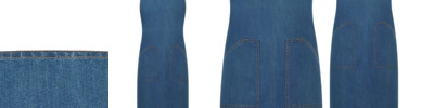70% polyester/30% cotton. Easy care fabric. Self fabric neckband with sliding, adjustable buckle. Two front pockets. Pen pocket. Self fabric 95cm ties. Width 72cm. Length 91cm. Contrast stitching on blue denim and indigo denim. Wash 60°C. Tear out label.