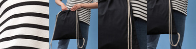 100% certified organic cotton. Combed, woven cotton. Carry/shoulder straps (67cm long). Tear out label. Capacity 10 litres. Hand wash only.