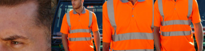 100% polyester. Conforms to EN ISO 20471: 2013 + A1: 2016 class 2. RIS-3279-TOM (orange only). Grey collar with contrast tipping. Taped neck. Three button placket. Two reflective bands around the body and one over each shoulder. Twin needle stitching.