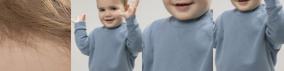 Kids' sweatshirt made in recycled fabric with self-fabric knitted rib at neck and cuffs. Flatlock V stitching detail at the CF neck. YKK popper fastening on the shoulder on sizes 0/6 – 24/36 only. Tag-free.