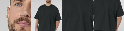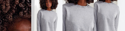 Set-in sleeve. Dropped shoulder. Wide 1x1 rib neck collar with single topstitch. Inside back neck tape in self-fabric. Sleeve hem and bottom hem with wide double topstitch.