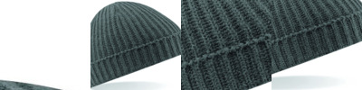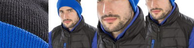 Beanie made from 50% recycled materials. Contrast colour deep cuff. Double thickness. Full size style. Soft-feel knit. .