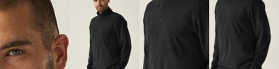 1x1 rib flat knit collar and cuffs. Double-stitched armholes, shoulders and cuffs. Side vents. 3 button narrow placket with slanted top. Taped back neck and shoulder seams. Twin-needle hem. Half moon back yoke. Spare button. Superwash® 60° swing ticket. Kustom Kit® tear out label.