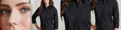 65% Polyester, 35% Cotton, plain poplin. Soft collar styling, rounded bottom hem. Fitted styling with bust darts and back darts. Easycare fabric. Pearlised buttons on light blue and white. Self coloured buttons on remaining colours. Size 6, 8, 10, 12, 14, 16, 18, 20, 22, 24, 26 * size 6 only avaialble in these colours