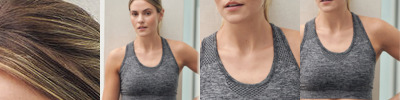 Seamless bra with removable padded cups and racerback. Self- fabric mesh inserts on front straps, V insert on front and on racerback panel. Self-fabric binding around neck, armholes and back. Tombo tear-out label.