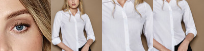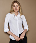 Fused soft stand up collar (no stiffeners) collar. 7-button placket with self-coloured buttons. Rounded hem. Single stitching around armholes. Double-stitched sleeves and side seams. Back yoke. Adjustable 2 button cuff with pointed no button cuff placket. Under bust darts. Back darts from hem to under arm point. Spare button. Kustom Kit® woven back neck label.