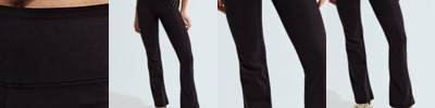 Full-length flared leggings. Soft-stretch fabric. Self-fabric waistband with hidden coin pocket. The product contains no branded neck or waist label. Removable kimble or looped garment tags. The inner seam label holds important product information on one label with a second label containing brand information which can be cut-away. We recommend using block out vinyl and inks.