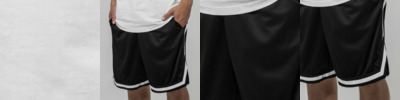 Polyester micro-mesh. Neutral size label without branding. Fashionable shaped hem with short side cut. White stripes at hem and side. With a drawstring at the waist.