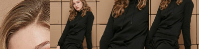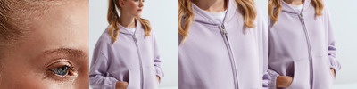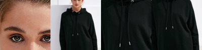 Ribbed cuffs and hem, outer fabric hood without drawstring, short cut and half-moon neck.